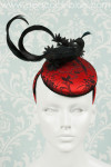 We're serving up a sweet little treat with our Cookie hats! The flirty little “Red Cherry” version of our fascinator-style domed button hat is made in red and black Asian brocade with a cherry blossom motif and trimmed with black branches, black velvet yo-yo flowers, black scroll braid and jet Swarovski crystals. This cocktail-style fascinator hat fastens securely to your head with the matching fabric-covered headband and small comb.
