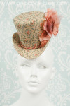 You'll always take center stage you when you’re wearing our show-stopping Spotlight topper! Our jaunty mini top hat is made of a vintage-inspired brocade of tan, peach, green, blue and brown tones with a band of cording in coordinating colors. This Spotlight topper is trimmed with a dark peach flower with hand-colored pips and peach colored vintage glycerinized ostrich feathers. This cocktail-style top hat fastens securely to your head with an elastic band and small comb.