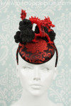 We're serving up a sweet little treat with our Cookie hats! The flirty little “Red Cherry” version of our fascinator-style domed button hat is made in red and black Asian brocade with a cherry blossom motif and trimmed with red branches, red velvet yo-yo flowers, black scroll braid and siam red Swarovski crystals. This cocktail-style fascinator hat fastens securely to your head with the matching fabric-covered headband and small comb.