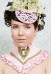 Our La Dacquoise series of neck corsets are sweet little treats served up in an array of pastel colors inspired by cakes and confections! The flirty little “Mint” version of our lace-up neckpiece is made in hand-dyed mint green re-embroidered lace layered over matching silk dupioni trimmed in hand-dyed ruffled lace with a cream scroll braid trim. The finishing touch on our Mint neck corset is a venise lace heart with a coordinating cameo. Corset-style lacing with satin ribbons at the back of this piece helps accommodate a variety of sizes.