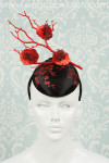 East meets West again in our unique Loyal Fan fascinator hat, inspired by our 2006 Citron Geisha wig! The button-shaped cap is covered in black and red Asian silk brocade with a dragon motif and trimmed in black scroll braid and a frog closure. A glossy black hand-painted wooden fan is surrounded by black flowers in the back and accented with a pair of sassy black tassels with red hand-painted beads in the front. This cocktail-style fascinator hat fastens securely to your head with the matching fabric covered headband and small comb.