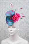 You'll always take center stage you when you’re wearing our show-stopping Spotlight topper! Our jaunty mini top hat is made of bright peacock blue and hot pink pink chrysanthemum theme Asian brocade with a band of box-pleated peacock blue satin ribbon accented with hot pink mini braid. This Spotlight topper is trimmed with two hot pink silk millinery roses and shaped coque feathers. This cocktail-style top hat fastens securely to your head with a peacock blue elastic band and small metal comb.